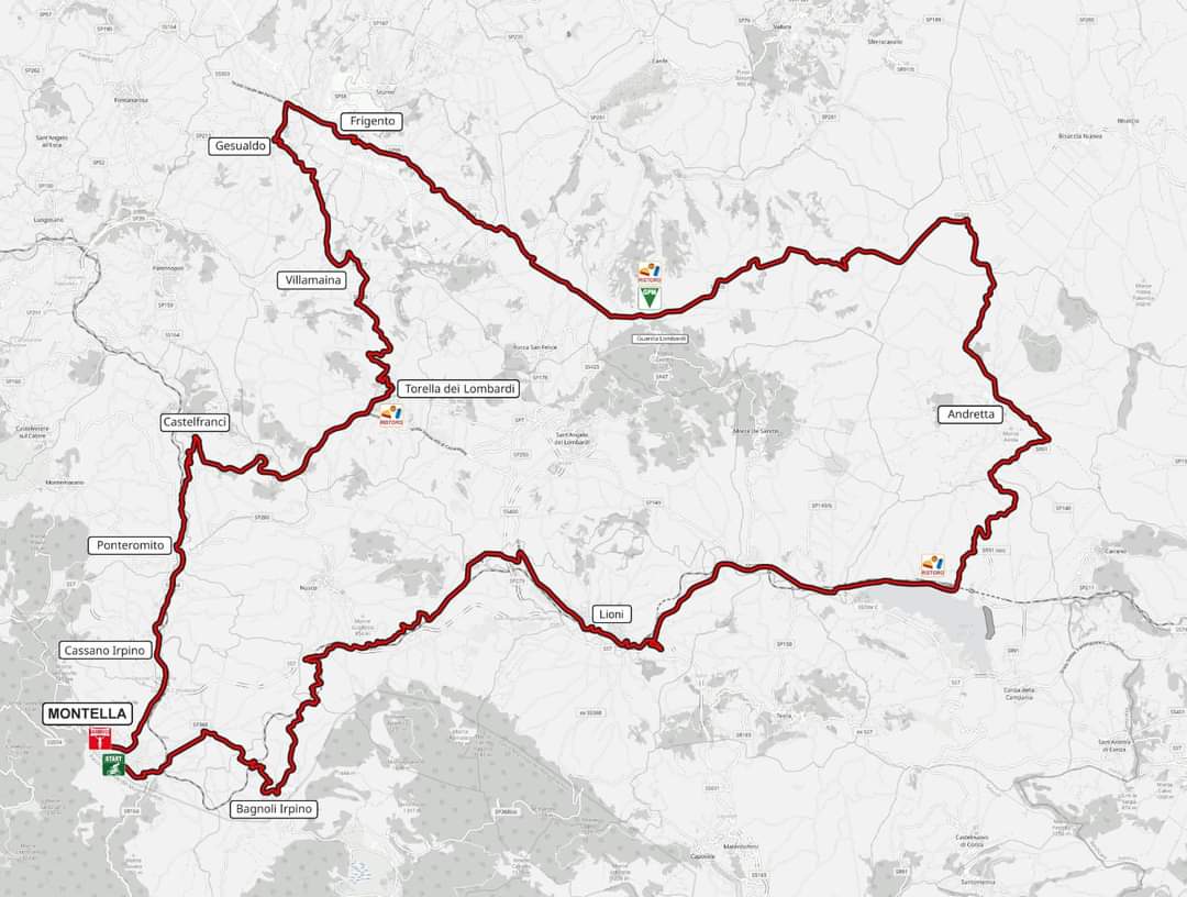 Diciotto i comuni attraversati: oltre Montella, la carovana passerà per Bagnoli Irpino, Nusco, Sant’Angelo dei Lombardi, Lioni, Marra de Sanctis, Conza della Campania, Andretta, Bisaccia, Guardia Lombardi (dove è posto l’unico granpremio della montagna, località Taverne di Guardia, a 972 metri sopra il livello del mare e a circa 70 km dalla partenza), Rocca San Felice, Sturno, Frigento, Gesualdo, Villamaina, Torella dei Lombardi, Castelfranci, Montemarano e Cassano Irpino.
