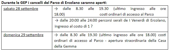 Al Parco Archeologico di Ercolano costi ordinari per le aperture diurne di sabato 28 e domenica 29 settembre, ma al costo simbolico di 1 euro si “camminerà” per le strade dell’antica città sabato 28 settembre di sera quando si riproporrà lo spettacolo che ha animato con tanto successo le serate estive con I Venerdì di Ercolano con le performance di “Teatri 35” e percorsi guidati illuminati.