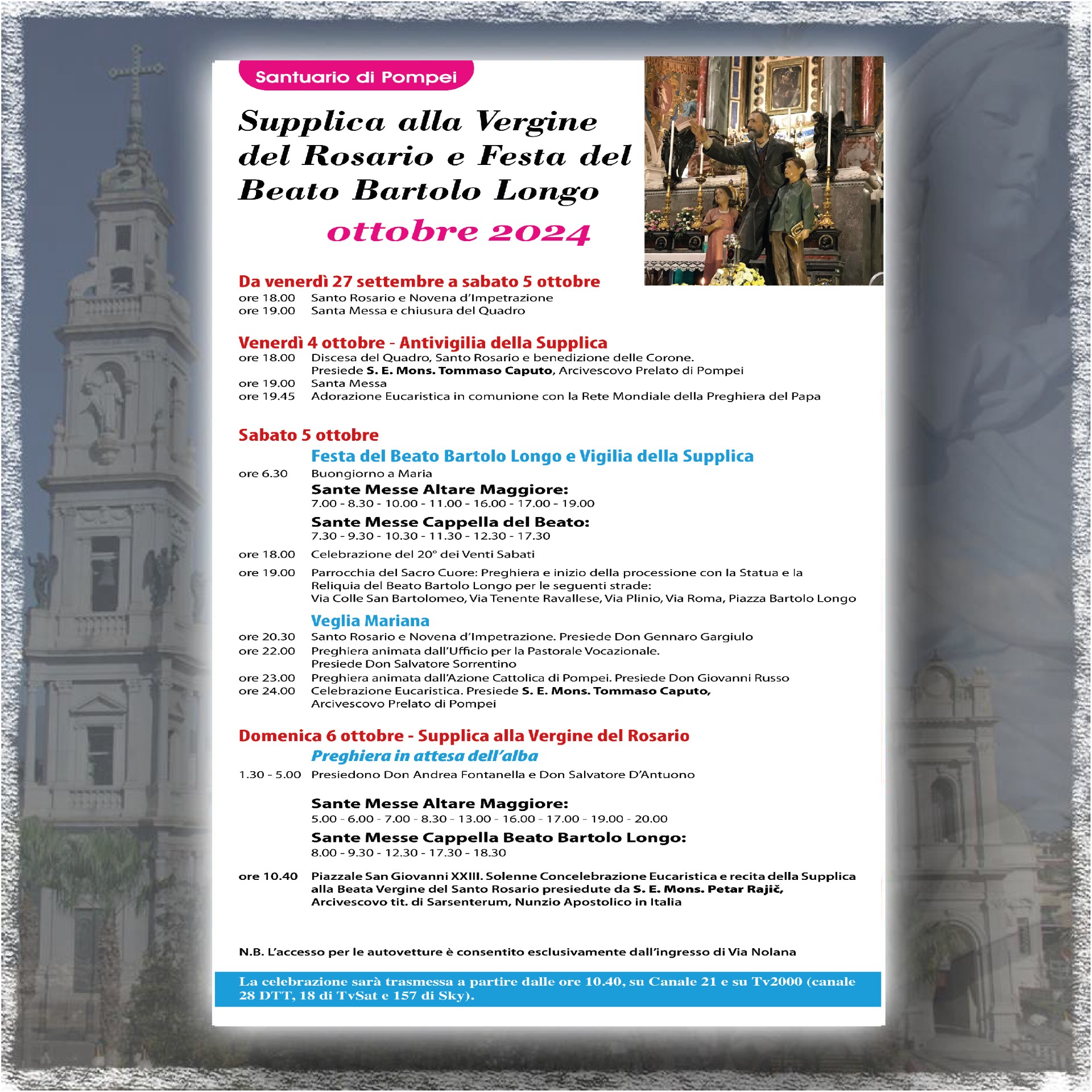 Il rito solenne, che avrà inizio alle 10.40 con la santa Messa, si svolgerà nel Piazzale “San Giovanni XXIII”. A presiedere la santa Messa e la Supplica sarà il nunzio apostolico in Italia e nella Repubblica di San Marino, Monsignor Petar Rajič, arcivescovo titolare di Sarsenterum. L’intero rito sarà trasmesso in diretta tv, a partire dalle 10.40, da Canale 21 (Canale 10 del digitale terrestre, 19 nel Lazio, in streaming sul canale youTube o su canale21.it) e da Tv2000 (Canale 28 del digitale terrestre, 18 di tivùsat e 157 di Sky). Su Tv2000 sarà trasmessa anche la diretta della santa Messa delle 8.30 dalla Basilica mariana.
