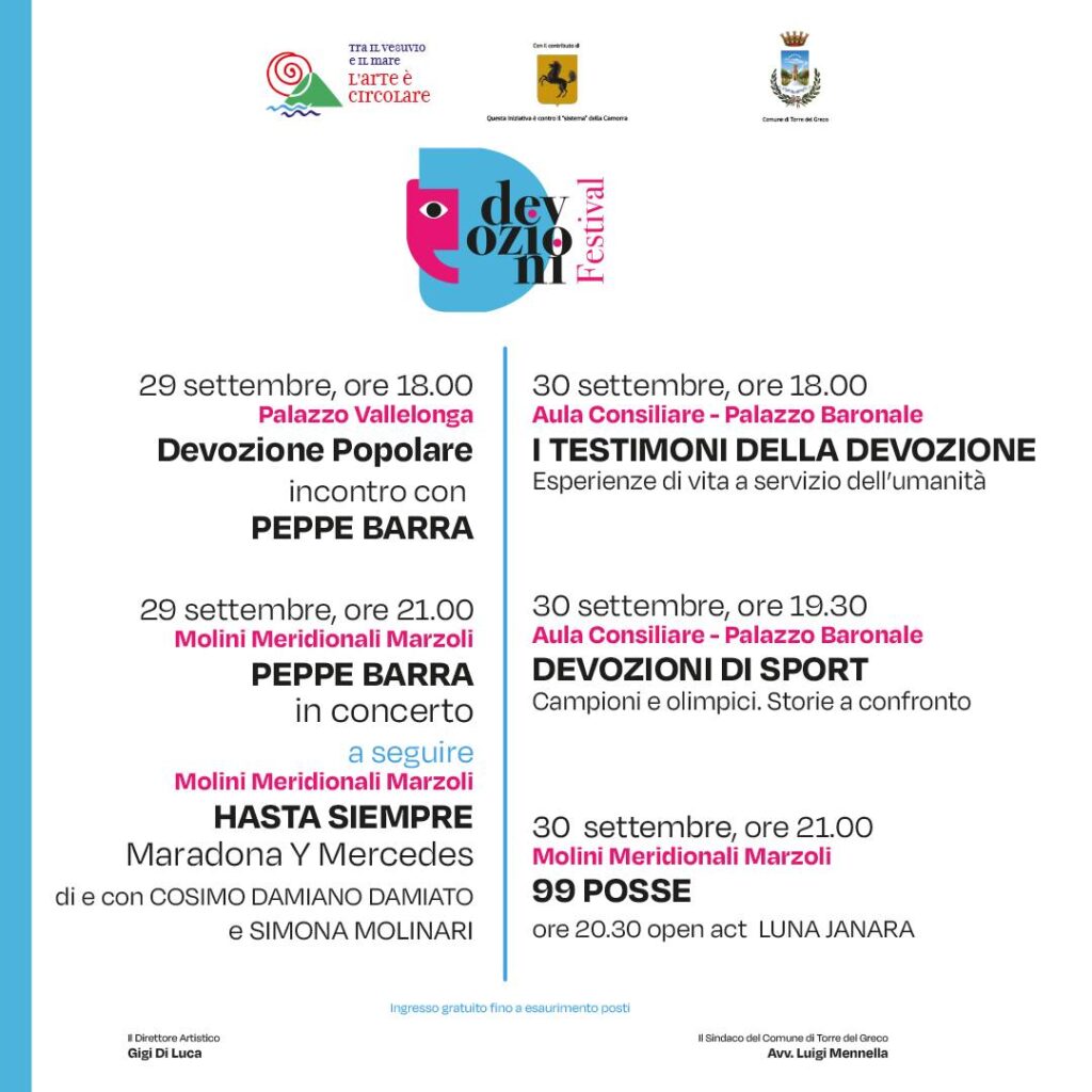 Peppe Barra e Simona Molinari, 99 Posse e Luna Janara. A Torre del Greco due giorni di musica, incontri e storie da raccontare con la III edizione di DEVOZIONI Festival. Ideato e diretto da Gigi Di Luca, finanziato da Città metropolitana di Napoli e organizzato dal Comune di Torre del Greco, nell’ambito del progetto “Tra il Vesuvio e il Mare l’Arte è Circolare”, Devozioni andrà in scena nella città corallina il 29 e 30 settembre. Due giornate dedicate al tema della devozione, intesa come passione per la vita, come appartenenza, fedeltà alle proprie idee. Come atto e testimonianza di fede, non strettamente dal punto di vista religioso, ma come abnegazione e impegno per i diritti umani e civili, come resilienza nel praticare uno sport oltre ogni limite.