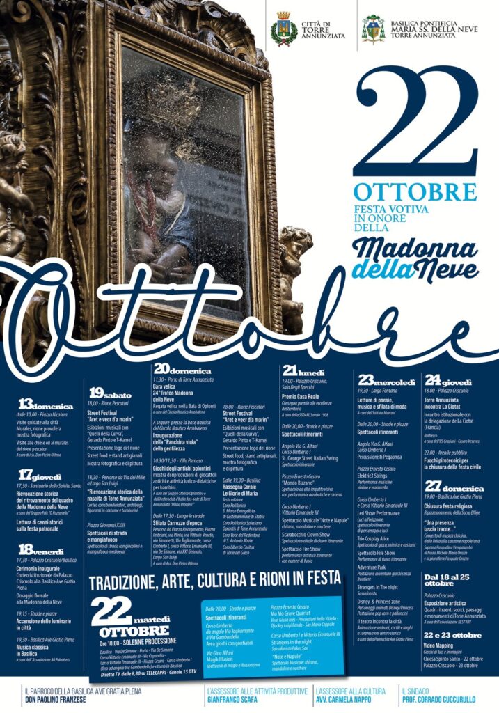 Tra gli appuntamenti in programma anche lo street festival “Aret e vecr’ d’a marin” il 19 e 20 ottobre nel rione Pescatori, il premio Casa Reale a cura del Savoia calcio il 21 ottobre a Palazzo Criscuolo, il videomapping il 22 e 23 ottobre sulla facciata dello Spirito Santo e di Palazzo Criscuolo e l’incontro istituzionale con la delegazione francese de La Ciotat, città gemellata con Torre Annunziata, giovedì 24.