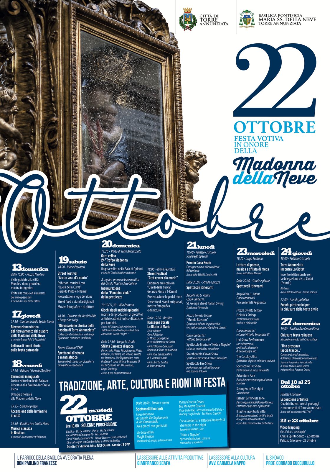 “Per la prima volta la Madonna percorrerà il corso cittadino fino a Via Cuparella. Negli ultimi anni infatti, l’impossibilità di percorrere via Castello, aveva tagliato fuori il centro storico e il quartiere murattiano. Quest’anno invece ho fortemente voluto che la Madonna, una volta risalita via De Simone, potesse scendere fino a via Cuparella per poi percorrere tutto il corso fino a via Gambardella. Quella fetta di territorio è il centro antico e merita di vivere appieno la gioia del 22 ottobre. Un risultato raggiunto in piena sintonia con don Paolino con il quale condivido questa prima Festa Patronale”.
