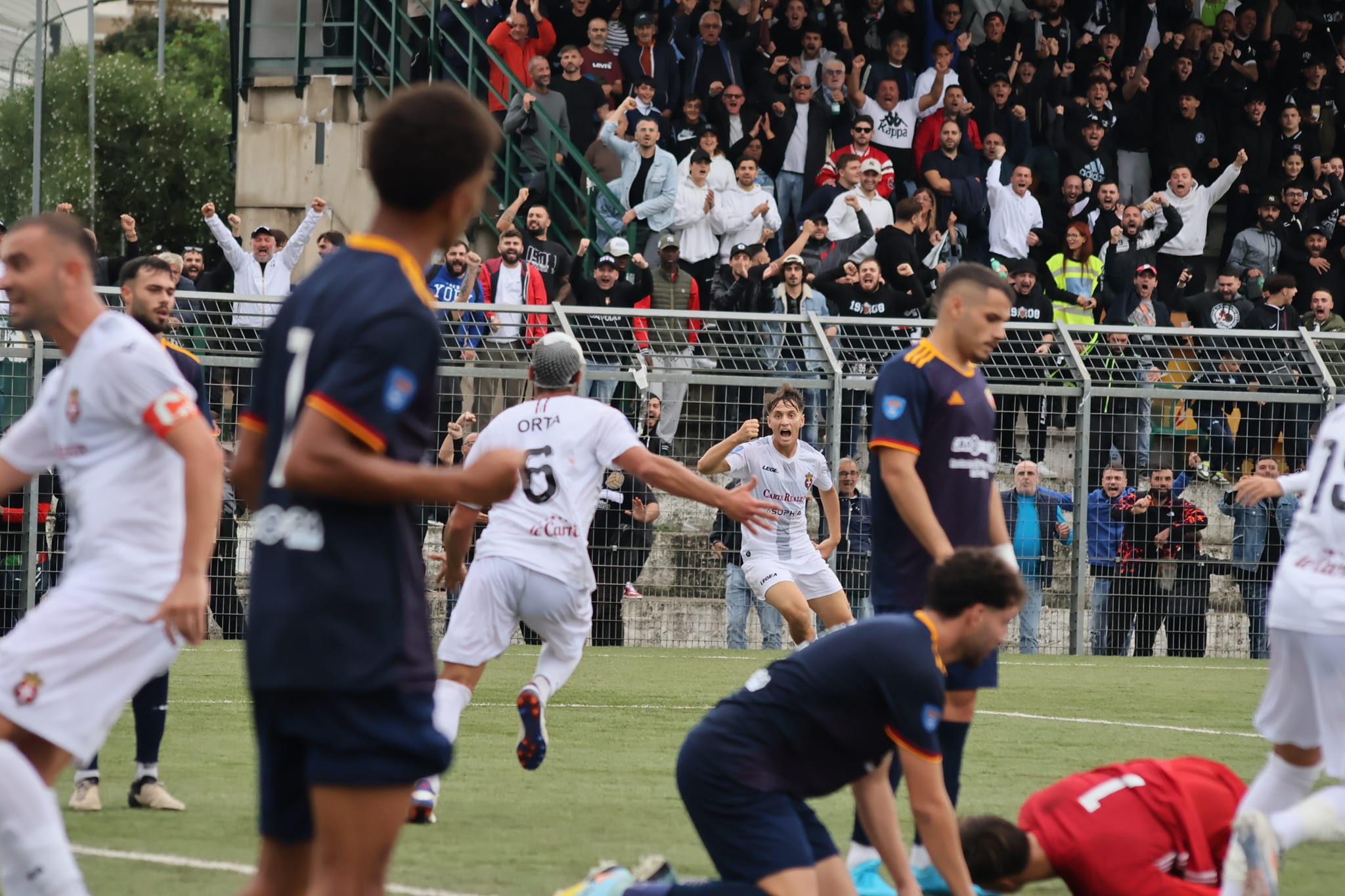 Nella ripresa il Savoia alza i giri del motore ed entra in campo ancora più “cattivo”, l’azione si sviluppa maggiormente sulle corsie ed i palloni che arrivano al centro hanno ben altra caratura rispetto alle proposte di gioco del primo tempo. Bitonto a destra e Onda a sinistra salgono con intelligenza ed è proprio su un pallone messo da Bitonto al minuto 55 che il Savoia trova la rete del pari. Portiere e difensore si scontrano sul cross operato dal giovane esterno oplontino ed Orta di testa può appoggiare comodamente in rete.