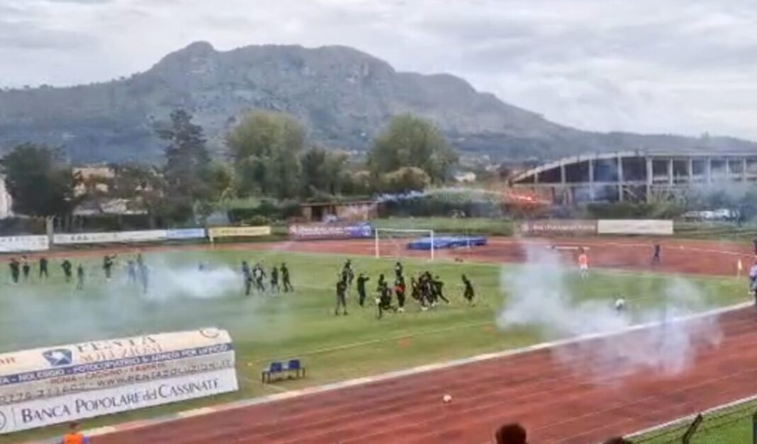 Alla fine del primo tempo, un gruppo di “tifosi” del Savoia ha invaso il campo cercando di raggiungere il settore occupato dai supporters del Cassino. Gli ultras campani hanno lanciato fumogeni e bombe carta, creando un clima di terrore sugli spalti dove erano presenti molte famiglie e bambini.