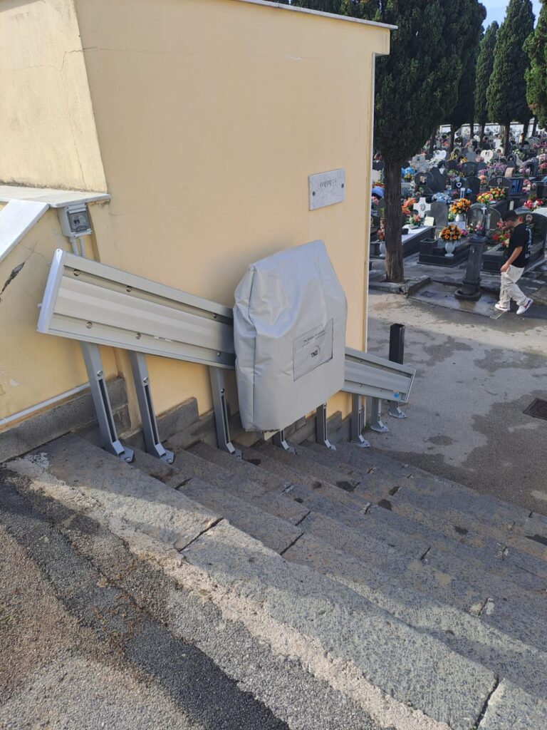 I frequentatori del camposanto noteranno la presenza di appositi scivoli e di altre migliorie utili a consentire un’adeguata fruizione a coloro i quali hanno difficoltà di deambulazione, ma anche alle mamme che si accompagnano con bambini piccoli e che quindi utilizzano i passeggini per i loro spostamenti. Alle scale interne, poi, sono stati posizionati appositi montascale che a breve entreranno in funzione. Senza dimenticare che la ditta incarica si sta adoperando per sistemare ascensori che permetteranno a tutti, a partire dalle persone più anziane, di superare agevolmente le aree che presentano più gradini”.
