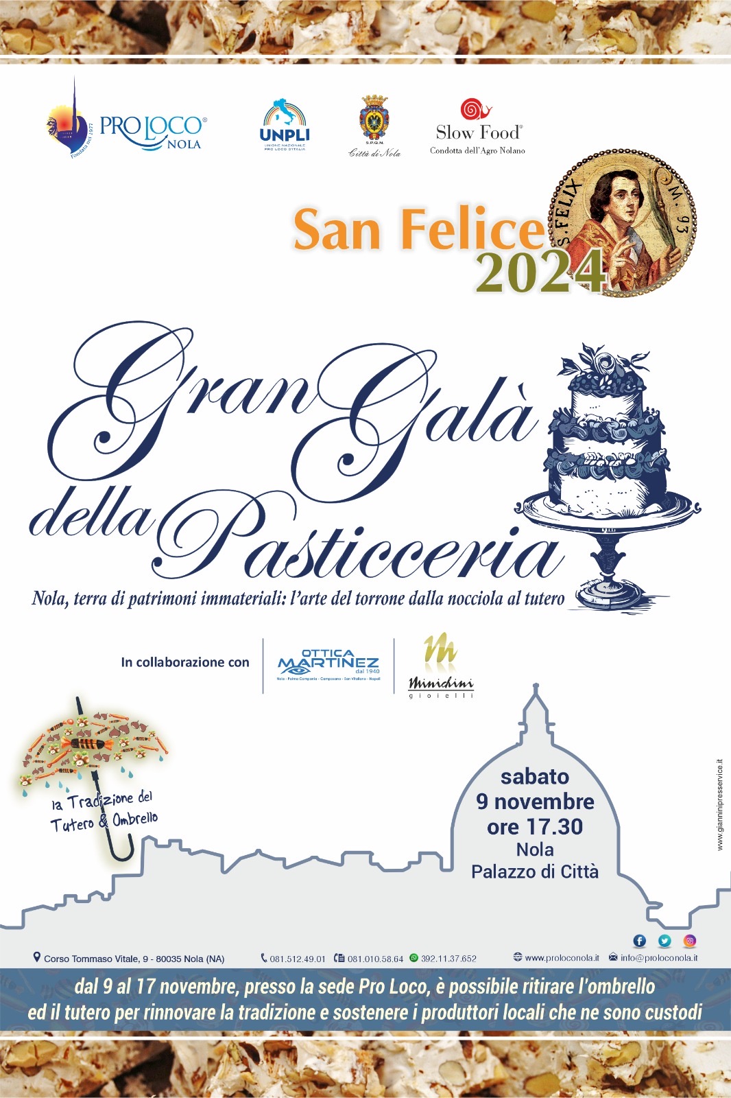 Tempo di San Felice, festa patronale della città di Nola che ogni anno vede le pasticcerie nolane preparare centinaia di tuteri. Il tipico torrone della festa, a cui è legata la credenza che porti protezione e prosperità se regalato insieme a un ombrello, sarà il protagonista degli eventi programmati dalla Pro Loco Nola da sabato 9 a domenica 17 novembre.