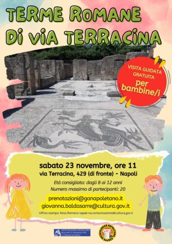 La Soprintendenza Archeologia, Belle Arti e Paesaggio per il Comune di Napoli ha previsto l’apertura straordinaria dei luoghi in collaborazione con il Gruppo Archeologico Napoletano. La visite guidate gratuite al Sito Archeologico delle Terme Romane di via Terracina di Napoli verranno effettuate sabato 9 e domenica 17 novembre dalle 09.00 alle 13.00, con turni di visita ore: 10.00 – 11.00 – 12.00. Per prenotare la visita occorre scrivere a info@ganapoletano.it. In occasione dell’apertura straordinaria delle Terme Romane sabato 23 novembre, dalle 11 alle 12, ci sarà una visita guidata gratuita per bambini e bambine, poiché il numero massimo di partecipanti è di 20 occorre prenotare scrivendo a giovanna.baldasarre@cultura.gov.it o prenotazioni@ganapoletano.it (Gruppo Archeologico Napoletano che si occuperà di organizzare il gruppo fino al raggiungimento del numero massimo di partecipanti).