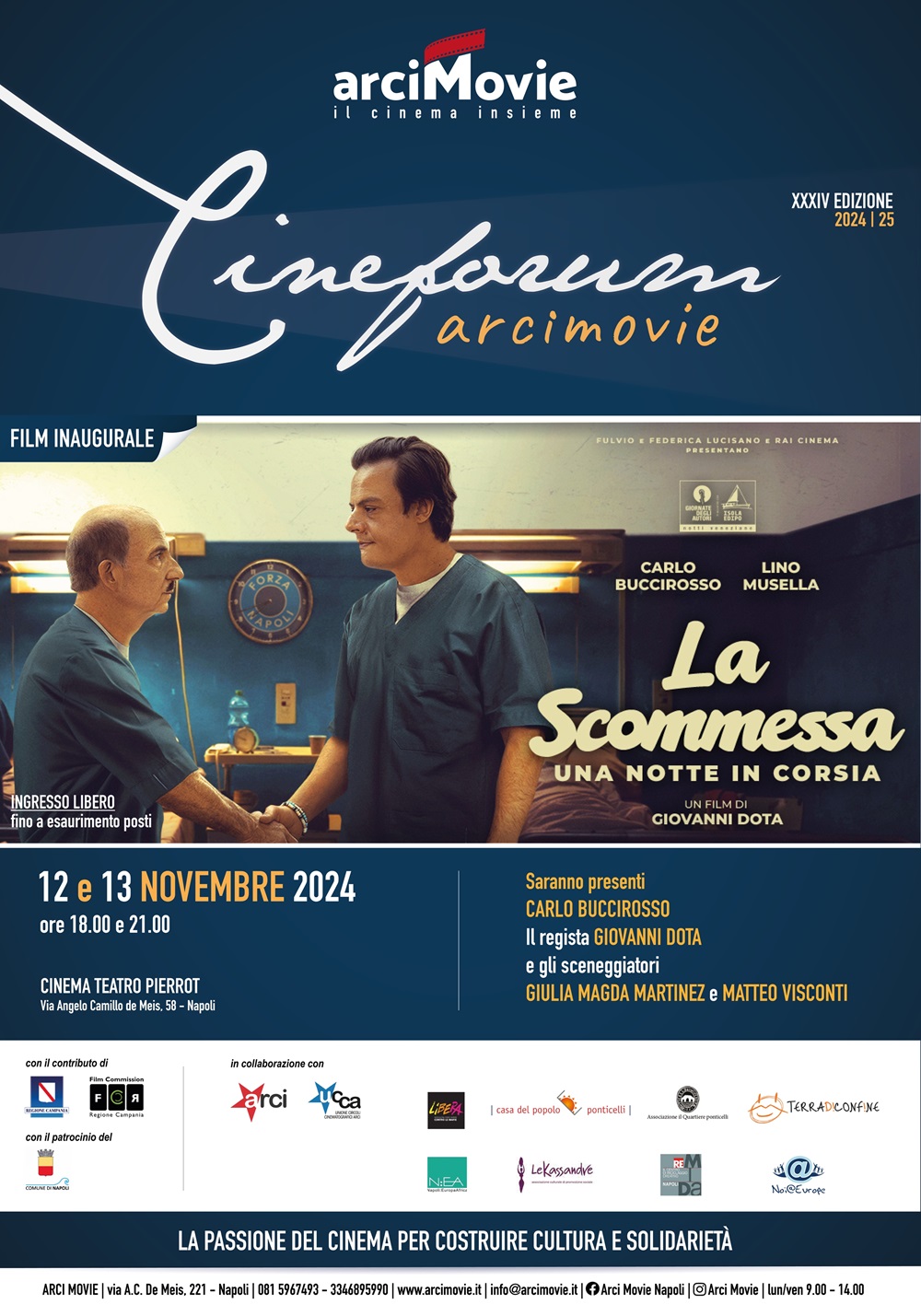 Prende il via una nuova edizione del Cineforum di Arci Movie nel cinema Pierrot di Napoli. La storica rassegna torna ad animare la sala di via De Meis a Ponticelli a partire dal 12 e 13 novembre 2024 con le proiezioni a ingresso gratuito de “La scommessa – Una notte in corsia” di Giovanni Dota che interverrà al Pierrot insieme all’attore Carlo Buccirosso. I due grandi protagonisti del cinema inaugurano la nuova edizione della kermesse che quest’anno si rivolge ai giovani con uno speciale abbonamento.