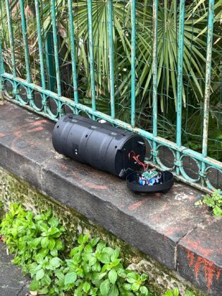 Lo striscione era lungo una ringhiera, mentre sul muretto vicino c’era un oggetto di medie dimensioni nero cilindrico dal quale sembravano uscire fili elettrici rossi.