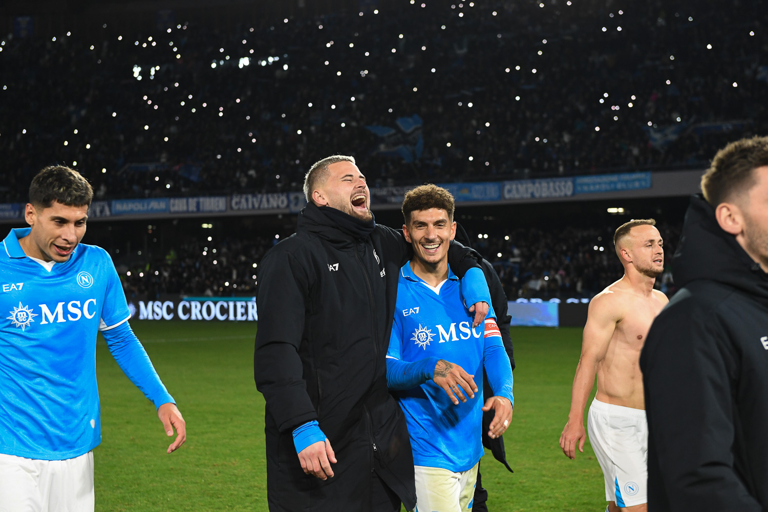 Ma il pomeriggio a Fuorigrotta si apre con tanta emozione e con la voce di uno dei più indimenticati figli di Napoli. L’atmosfera magica per un anno di calcio forse inaspettato si completa con la magia della voce di Pino Daniele. Prima di battere il calcio d’inizio partono le note di un inedito postumo, “Again”, che in anteprima assoluta ha commosso i 50 mila del Maradona.