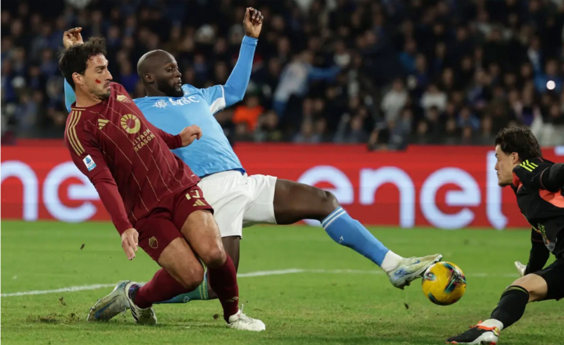 Primo tempo di grande intensità degli Azzurri che schiacciano i giallorossi. Al primo minuto grande occasione per Kvara, ma il georgiano spreca. Roma molto chiusa, in particolare al centro, Ranieri sceglie il 4-4-2, così facendo le vie centrali sono chiuse e il Napoli deve spingere sugli esterni per trovare occasioni. Proprio da un azione sull’esterno, ad inizio ripresa, arriva il goal del vantaggio partenopeo. Cross di Di Lorenzo, Lukaku anticipa tutti e insacca (quinto goal in campionato per il belga).