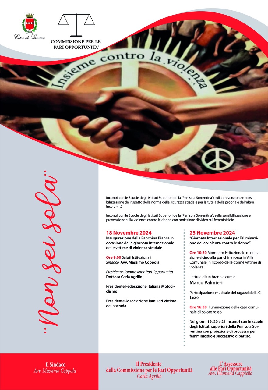 Domani 25 novembre, in occasione della Giornata internazionale per l’eliminazione della violenza contro le donne, la Commissione per le Pari Opportunità del Comune di Sorrento ha organizzato due appuntamenti.