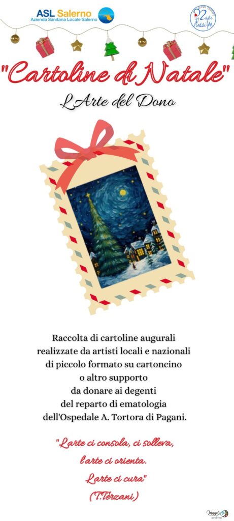 “Cartoline di Natale”- L’arte del dono- è una iniziativa di condivisione artistica ideata dall’artista Lorenzo Basile assieme alla coordinatrice del reparto di ematologia dell’Ospedale A. Tortora di Pagani dott. ssa Carmela Trezza, con la supervisione del primario prof. Catello Califano e con la collaborazione dell’Associazione Nasi Rossi Clownw Therapy presieduta dalla dott. ssa Francesca Colombo.
