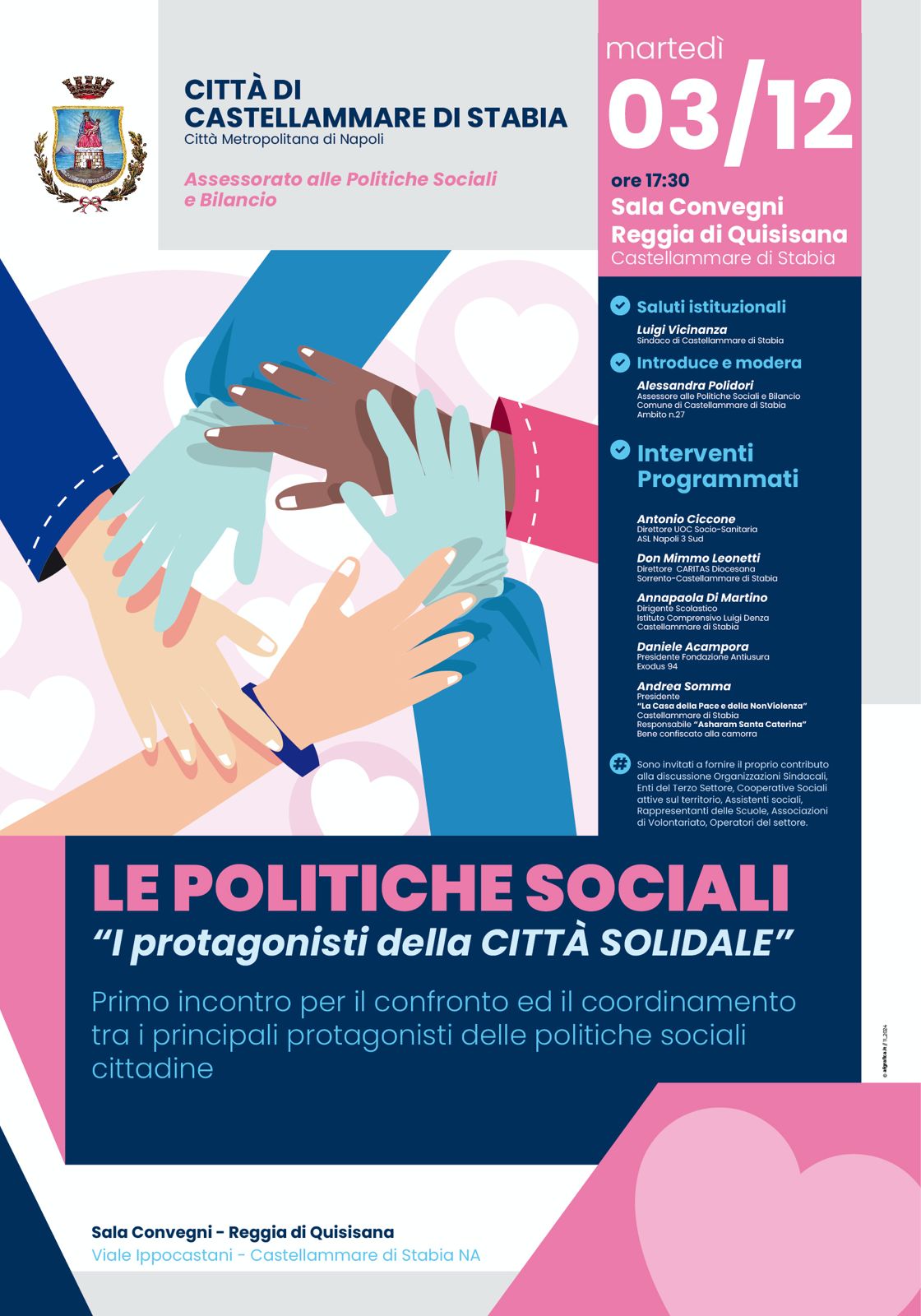 Si terrà martedì 3 dicembre, alle ore 17:30, presso la sala convegni della Reggia di Quisisana di Castellammare di Stabia, il convegno dal titolo “Le Politiche Sociali – I protagonisti della Città Solidale”. Si tratta del primo incontro dedicato al confronto e al coordinamento tra i principali attori delle politiche sociali cittadine.
