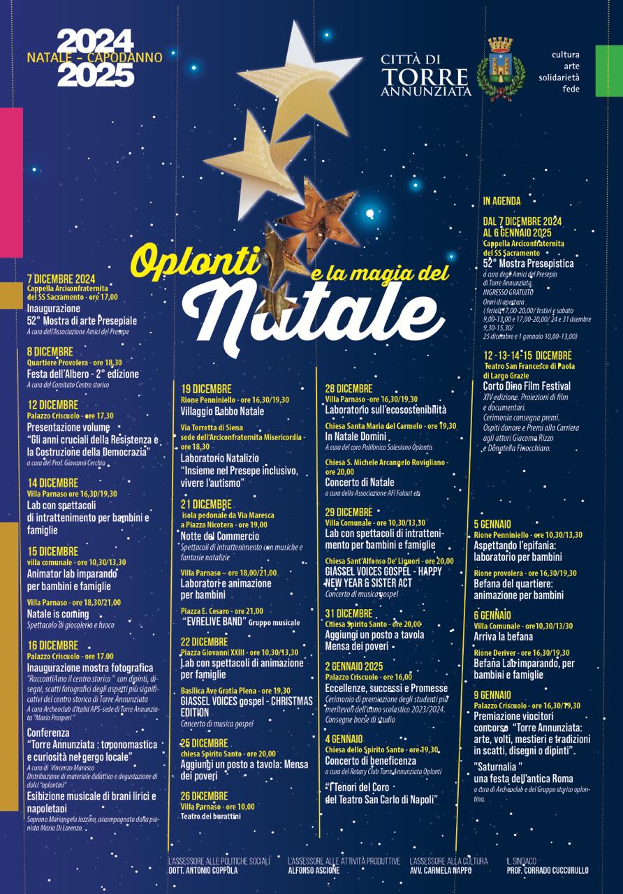“Quest’anno, il Natale a Torre Annunziata non è solo una celebrazione, ma un viaggio attraverso le radici, i valori e le eccellenze di una comunità che guarda con entusiasmo al futuro. Poi, a supporto del tessuto commerciale locale, il calendario prevede anche le attesissime ‘Notti Bianche del Commercio’. Queste serate speciali animeranno le vie dello shopping con aperture straordinarie dei negozi, spettacoli itineranti, isole pedonali e un’atmosfera unica, invitando residenti e turisti a vivere la città in un clima di festa”, ha dichiarato il Sindaco Corrado Cuccurullo.
