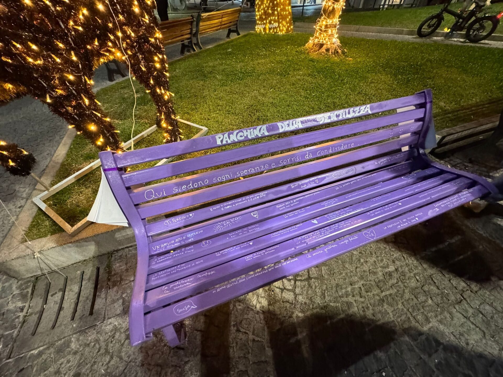 La Panchina, di colore Viola, è stata inaugurata ufficialmente sabato sera dopo l’accensione dell’Albero di Natale e delle luminarie natalizie.