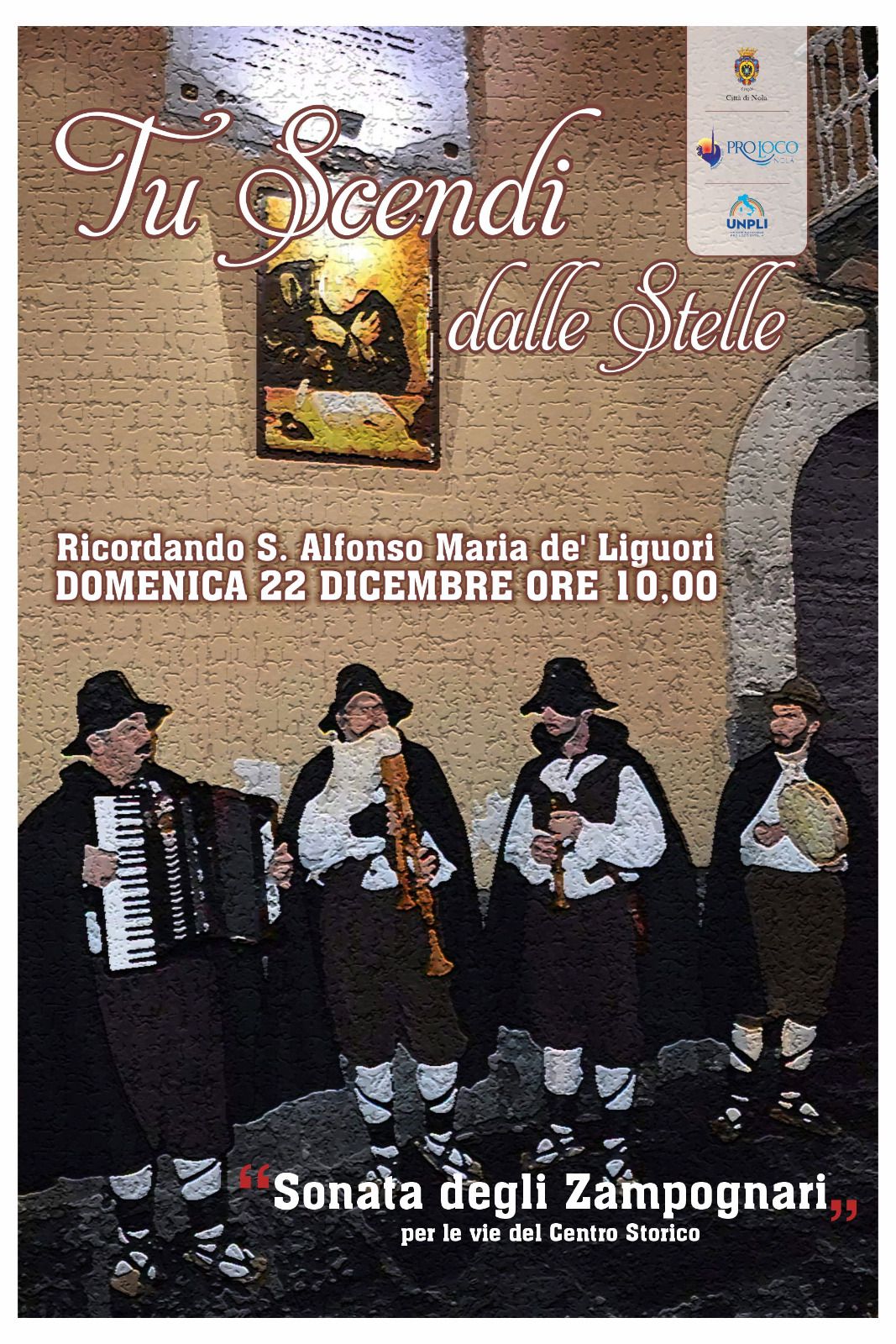 Otto compagnie teatrali, quindici attori e figuranti, tre repliche in una serata che si preannuncia magica…quella che evocherà la notte in cui nacque “Tu scendi dalle stelle”. La celebre pastorale, composta da Sant’Alfonso Maria de Liguori nel 1754, è nata a Nola durante un soggiorno del Santo, come la Pro Loco di Nola da anni ricorda. E domenica 15 dicembre l’associazione ancora una volta chiamerà a raccolta le compagnie teatrali Pipariello, Il Dialogo, GAD Radici, insieme a La Quinta Nera, Compagnia Teatrale Amatoriale Hyria, Pro Teatro, O’ spassatiempo e ComeTe per raccontare alla città questo avvenimento storico che allo stesso tempo è una bella storia di Natale.
