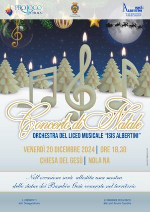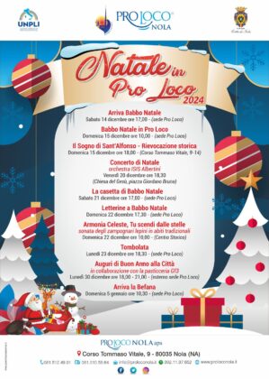 Venerdì 20 dicembre, invece, l’orchestra del liceo musicale Albertini di Nola si esibirà in “Concerto di Natale” nella chiesa del Gesù alle ore 18.30. Infine gli appuntamenti dedicati ai soci della Pro Loco ma estesi a tutti gli amici, alle associazioni e alla comunità, invitata ad unirsi per lo scambio di auguri di Natale lunedì 23 dicembre alle ore 18.30 e per il brindisi di fine anno di lunedì 30 dicembre, quando dalle ore 18 ci saranno musica e degustazioni, a cura della pasticceria Gf3, per celebrare l’anno che finisce e soprattutto quello che verrà.
