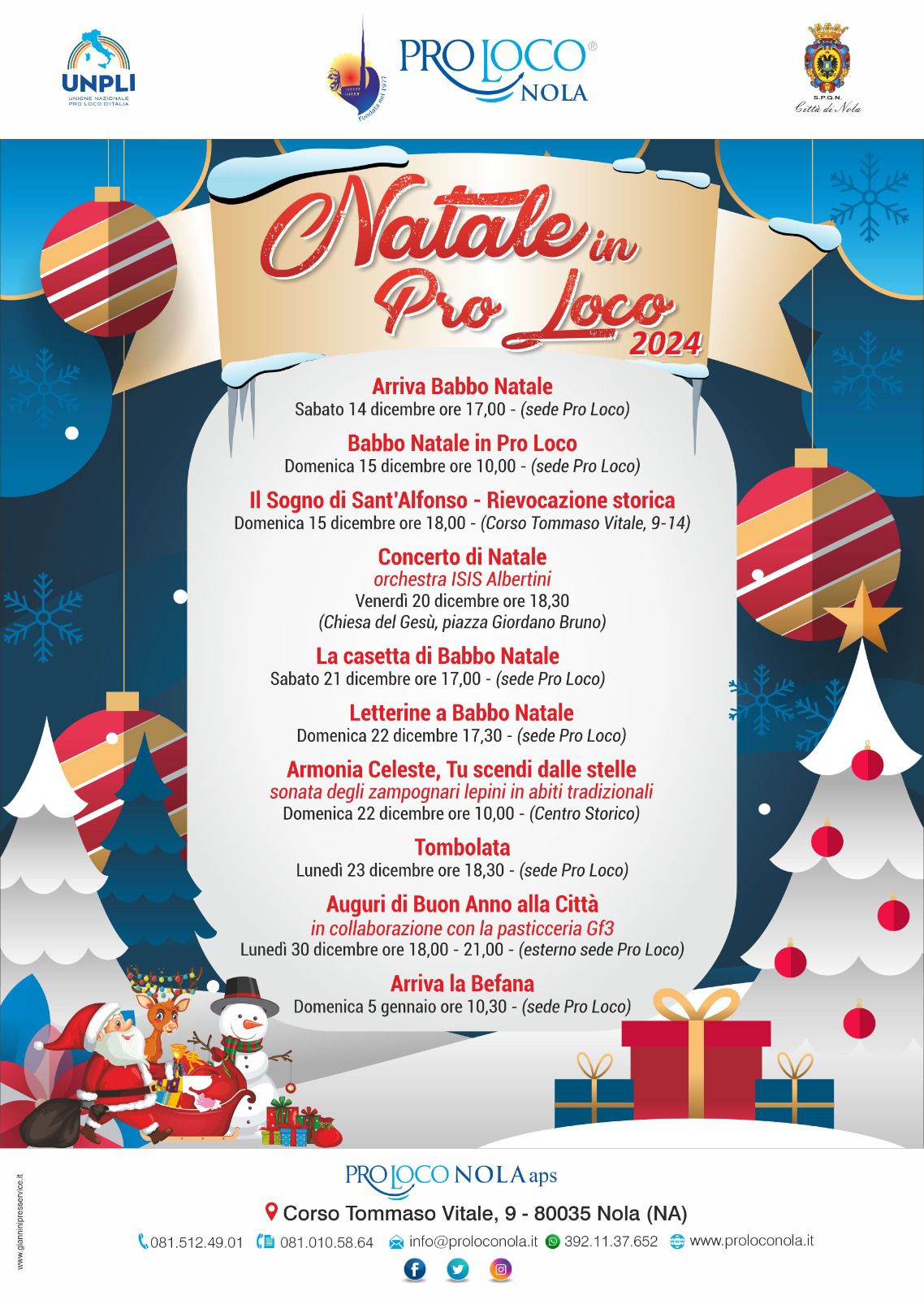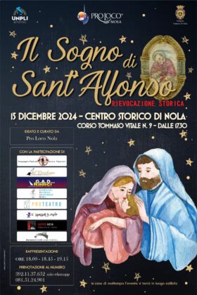 La rievocazione si terrà presso la sede della Pro Loco, in corso Tommaso Vitale 9, in tre repliche, alle 18, alle 18.45 e alle 19.15; la partecipazione è gratuita ma è richiesta la prenotazione telefonica. L’evento “Il Sogno di Sant’Alfonso” è la punta di diamante del calendario di appuntamenti per grandi e piccini voluto dalla Pro Loco di Nola per queste festività natalizie. Come tutti gli anni, anche questo dicembre ci sarà Babbo Natale in sede sabato 14 e 21 dalle ore 17, domenica 15 dalle 10 e domenica 22 dalle 17, e gli zampognari in corteo per il centro storico domenica 22 dalle ore 10.