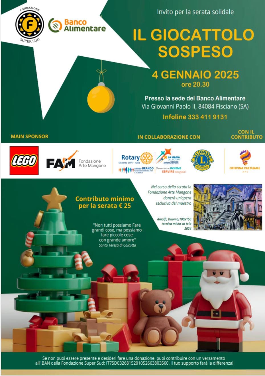 La Fondazione Super Sud, in collaborazione con il Banco Alimentare e la Fondazione Arte Mangone, presenta l’evento di beneficenza “Il Giocattolo Sospeso”, un’occasione speciale che unisce solidarietà, arte e condivisione per portare gioia ai bambini ricoverati negli ospedali pediatrici della Campania. La serata si terrà il 4 gennaio 2025 alle ore 20:30 presso la sede del Banco Alimentare, in Via Giovanni Paolo II a Fisciano (SA). L’obiettivo è quello di raccogliere fondi per donare giocattoli ai piccoli pazienti, trasformando un gesto di generosità in un momento di speranza e felicità. Durante l’evento, sarà presentata una straordinaria opera d’arte intitolata “Amalfi, Duomo”, realizzata dal maestro e donata dalla Fondazione Arte Mangone. Questo capolavoro rappresenta non solo la bellezza dell’arte ma anche i valori di solidarietà e unità che animano l’iniziativa. La serata vedrà il sostegno di partner e sponsor di rilievo, tra cui LEGO, il Rotary Club Distretto 2101 e il Lions Club, che insieme alla Fondazione Arte Mangone e ad altre realtà solidali contribuiscono alla realizzazione di questo progetto.