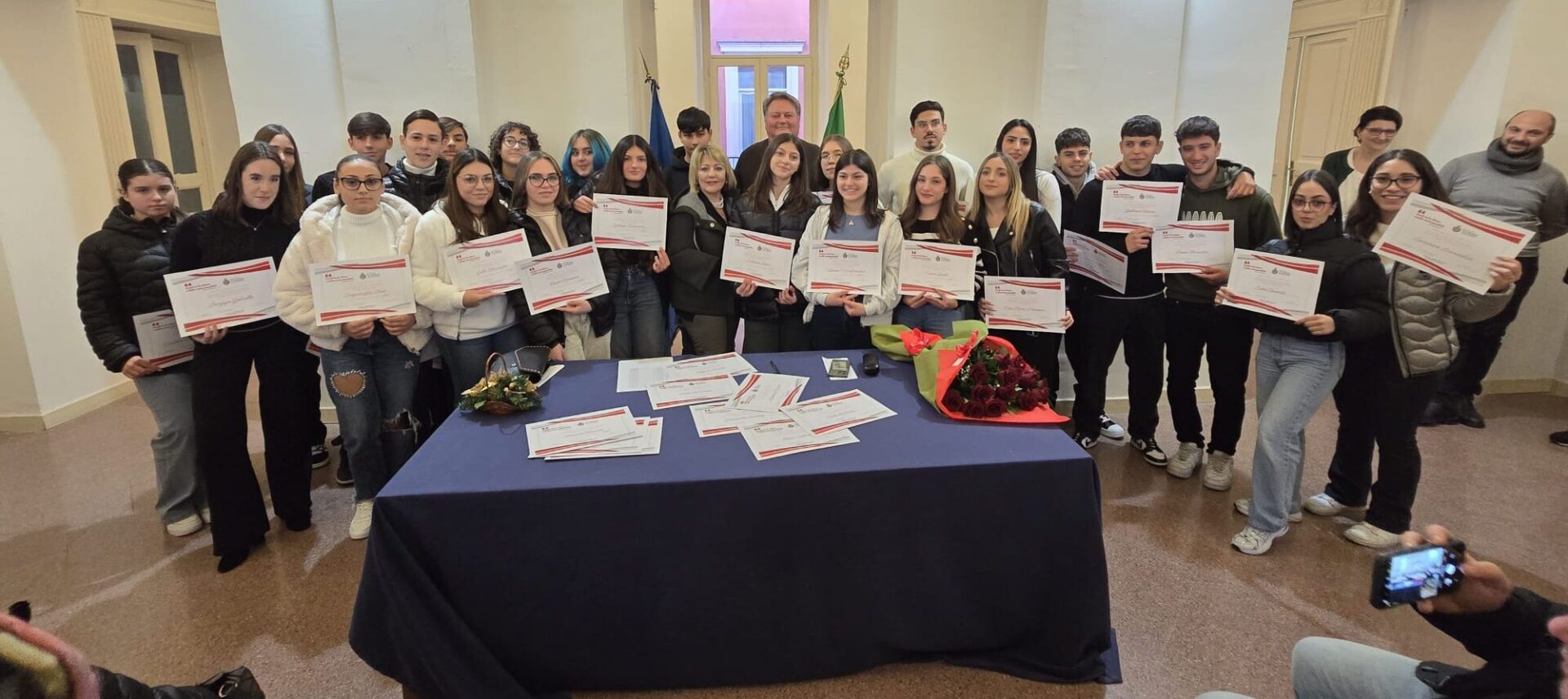 Si è svolta ieri pomeriggio a Palazzo Criscuolo la cerimonia di consegna degli attestati di merito per 35 studenti di Torre Annunziata. L’iniziativa era rivolta agli studenti del terzo anno della scuola secondaria di I grado e del quinto anno della scuola secondaria di II grado, che la scorsa estate si sono diplomati con il massimo dei voti.