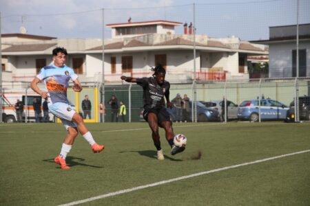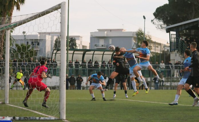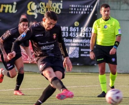 Poco male per i torresi perchè riescono egualmente a chiudere sul doppio vantaggio la prima frazione. Minuto 36, azione concertata sulla destra dell’attacco biancoscudato, una delle poche, e cross insidioso di Schiavi; Pompei, fronte alla porta e messo male con il corpo, cerca il rinvio di sinistro ma spara un maldestro mezzo piattone alle spalle dell’incolpevole portiere.