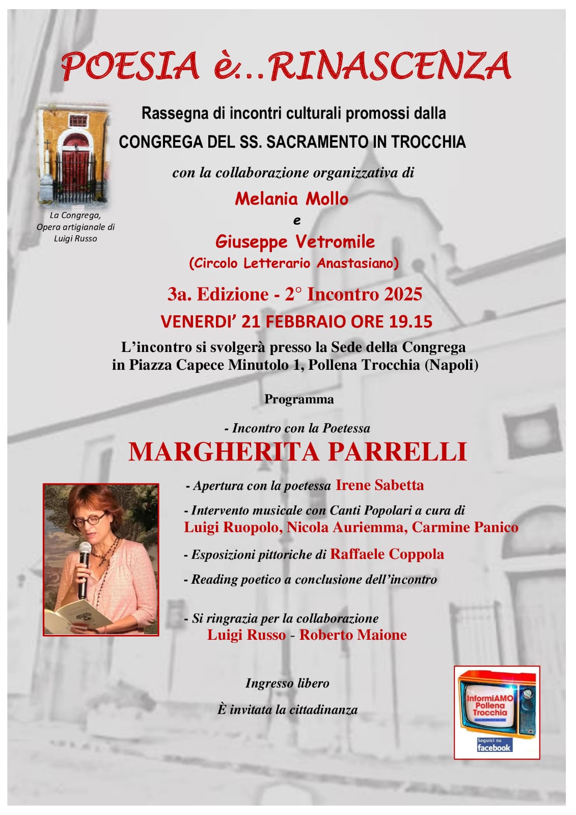L’appuntamento con il secondo incontro della terza edizione di “Poesia è… Rinascenza” è come di consueto presso la sede della Congrega del Santissimo Sacramento in Piazza Capece Minutolo a Pollena Trocchia. «Come sempre diciamo grazie a chi contribuisce alla Rassegna, giunta ormai al suo terzo anno di attività culturale sul territorio locale di Pollena Trocchia e regionale, in particolare Luigi Russo, Roberto Maione e il Blog “Informiamo Pollena Trocchia”» hanno concluso Mollo e Vetromile. L’ingresso all’evento è libero e sarà molto gradita la presenza di tutti.