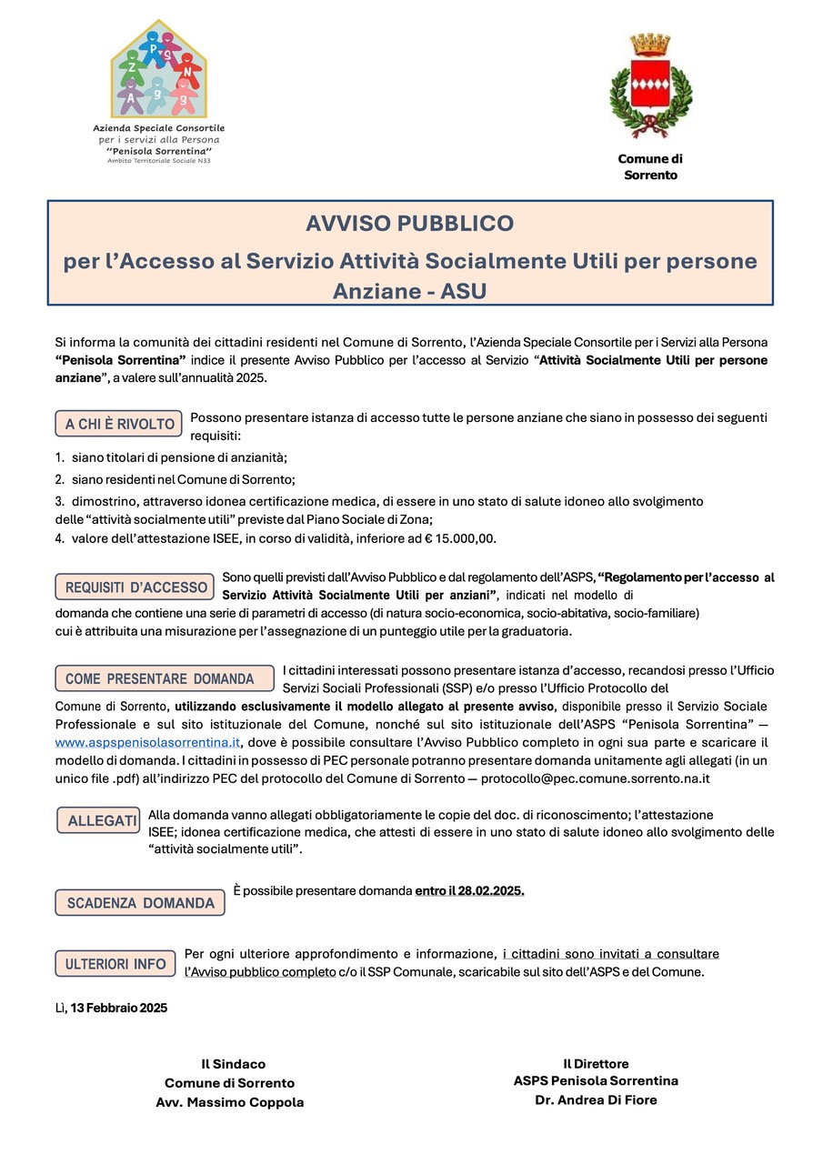 Tutte le informazioni e la modulistica sono disponibili a questo link: https://comune.sorrento.na.it/novita/notizie/lavviso-pubblico-laccesso-al-servizio-attivita-socialmente-utili-persone-anziane