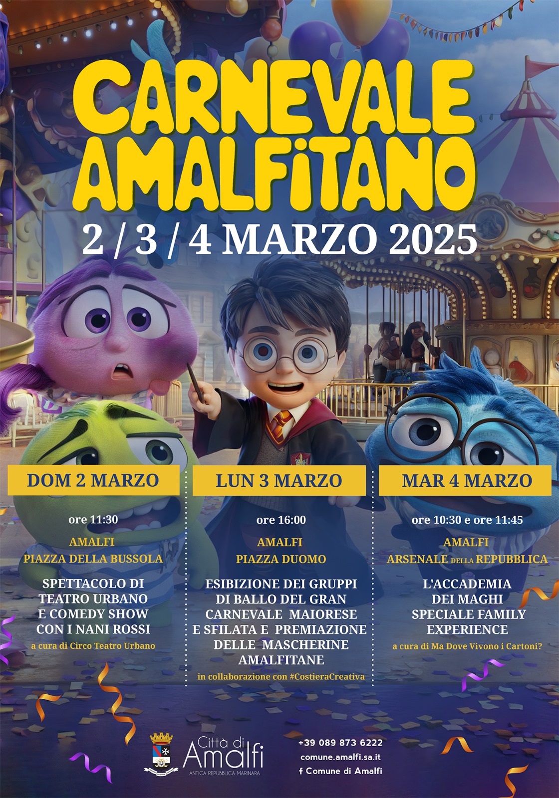Lunedì 3 Marzo 2025, come da tradizione, alle ore 16 in Piazza Duomo ci sarà l’esibizione dei gruppi di ballo del Gran Carnevale Maiorese, la sfilata e premiazione delle Mascherine Amalfitane, in compagnia delle Mascotte di Inside Out.