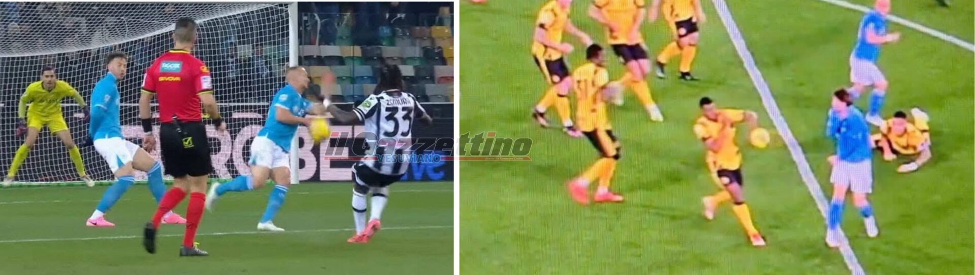 UDINESE – NAPOLI, tocco di mano di Lobotka e l’arbitro “Dov’eri” assegna il calcio di rigore ai friulani, poiché il centrocampista del Napoli aumenta il volume corporeo con il suo braccio.