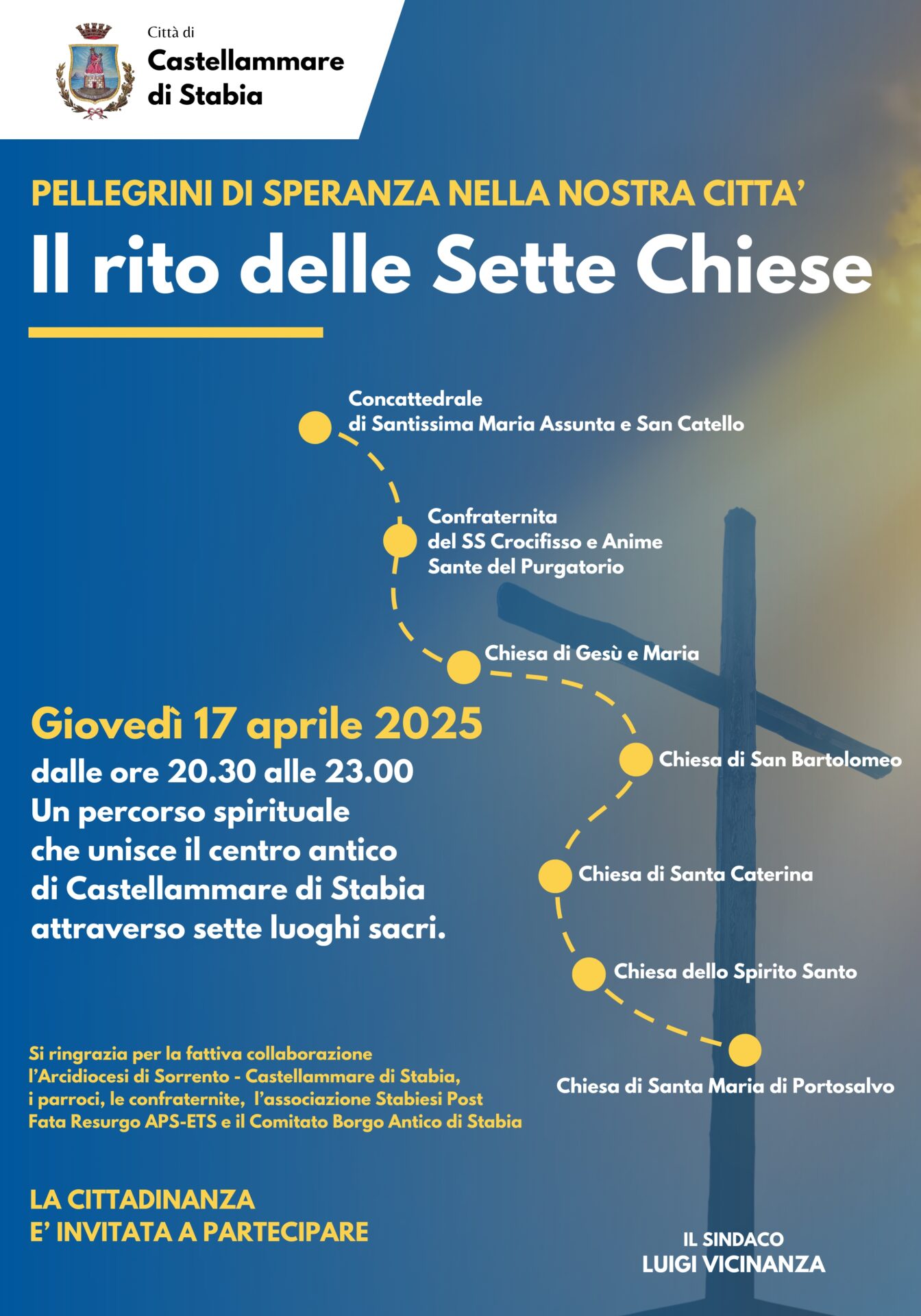 Primo appuntamento giovedì 17 aprile con il rito del “Giro delle Sette Chiese”, un percorso spirituale che unirà il centro antico della città stabiese attraverso sette luoghi sacri. L’iniziativa è frutto della collaborazione tra l’Amministrazione Comunale, guidata dal sindaco Luigi Vicinanza, e l’Arcidiocesi Sorrento-Castellammare di Stabia, i parroci, le confraternite e le associazioni stabiesi Post Fata Resurgo e Comitato Borgo Antico di Stabia. Dalle ore 20:30 alle ore 23:00 sarà possibile attraversare il centro antico ed entrare per un momento di preghiera e raccoglimento nelle sette chiese disseminate lungo il percorso: dalla Concattedrale di Santissima Maria Assunta e San Catello fino alla Chiesa di Santa Maria di Portosalvo, passando per la Confraternita del SS. Crocifisso e Anime Sante del Purgatorio, la Chiesa di Gesù e Maria, la Chiesa di San Bartolomeo, la Chiesa di Santa Caterina e la Chiesa dello Spirito Santo.