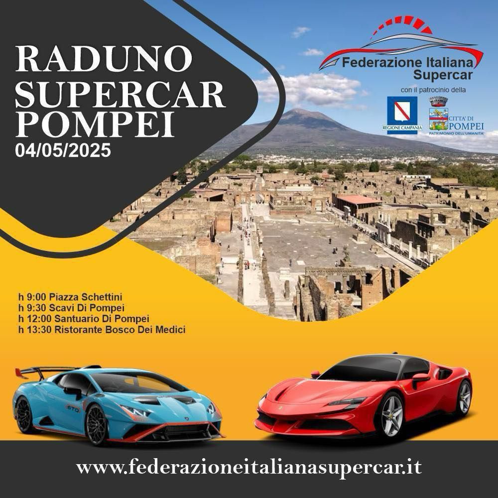 Domenica 4 maggio Pompei sarà teatro di uno spettacolo straordinario con Ferrari, Lamborghini, Porsche e molte altre Supercar che riempiranno piazza Schettini per il grande raduno organizzato dalla Federazione Italiana Supercar, presieduta da Luigi Iossa.