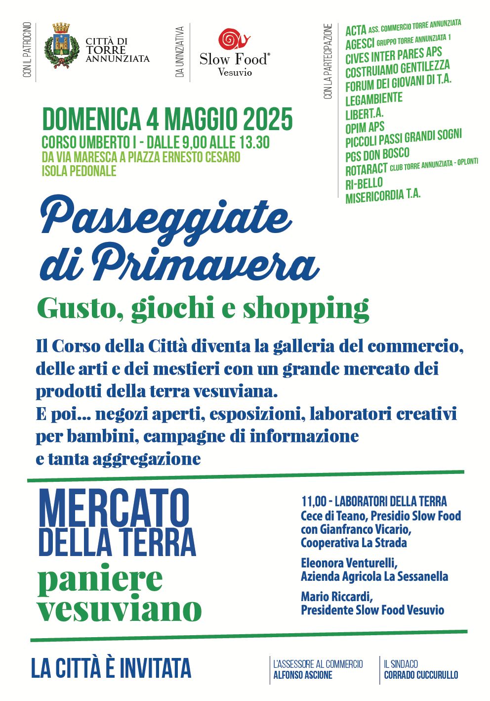 “Abbiamo raccolto con entusiasmo la proposta che ci è arrivata dall’Associazione Commercianti di partecipare all’iniziativa promossa da Slow Food – spiegano l’assessore Ascione e il sindaco Cuccurullo – l’iniziativa organizzata lo scorso 30 marzo ha avuto un ottimo successo. Per questo abbiamo messo insieme la disponibilità di Slow Food di tornare nuovamente a Torre Annunziata con la voglia dei commercianti e delle associazioni di essere partecipi di una domenica dedicata alle famiglie. Da qui è nato il progetto delle Passeggiate di Primavera”.