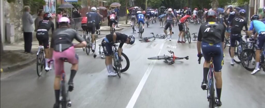 La maxi-caduta ha costretto al ritiro diversi corridori tra cui Hindley, Smith, Hollman, Van den Bossche e consente alla Maglia Rosa Pedersen di rallentare il ritmo senza conseguenze in classifica ed evitare rischi che avrebbero potuto compromettere il resto del Giro. Il danese rimane in maglia rosa, con 17 secondi di vantaggio su Primoz Roglic. Domani la settima tappa, la Castel di Sangro – Tagliacozzo di 168 km, col primo arrivo in salita che potrebbe già dare qualche indicazione per la lotta finale.
