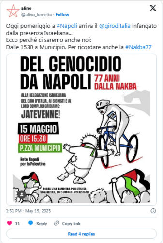 Le rivendicazioni: “Fuori Israele dal Giro d’Italia”