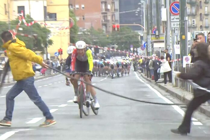 L’episodio più pericoloso si è verificato a circa tre chilometri dall’arrivo, in via Cristoforo Colombo, quando due manifestanti hanno cercato di ostacolare il passaggio dei fuggitivi — Enzo Paleni e Taco van der Hoorn — impugnando un tubo e ponendosi davanti ai corridori. Il gesto, filmato da diversi spettatori, ha avuto un impatto diretto sulla corsa.