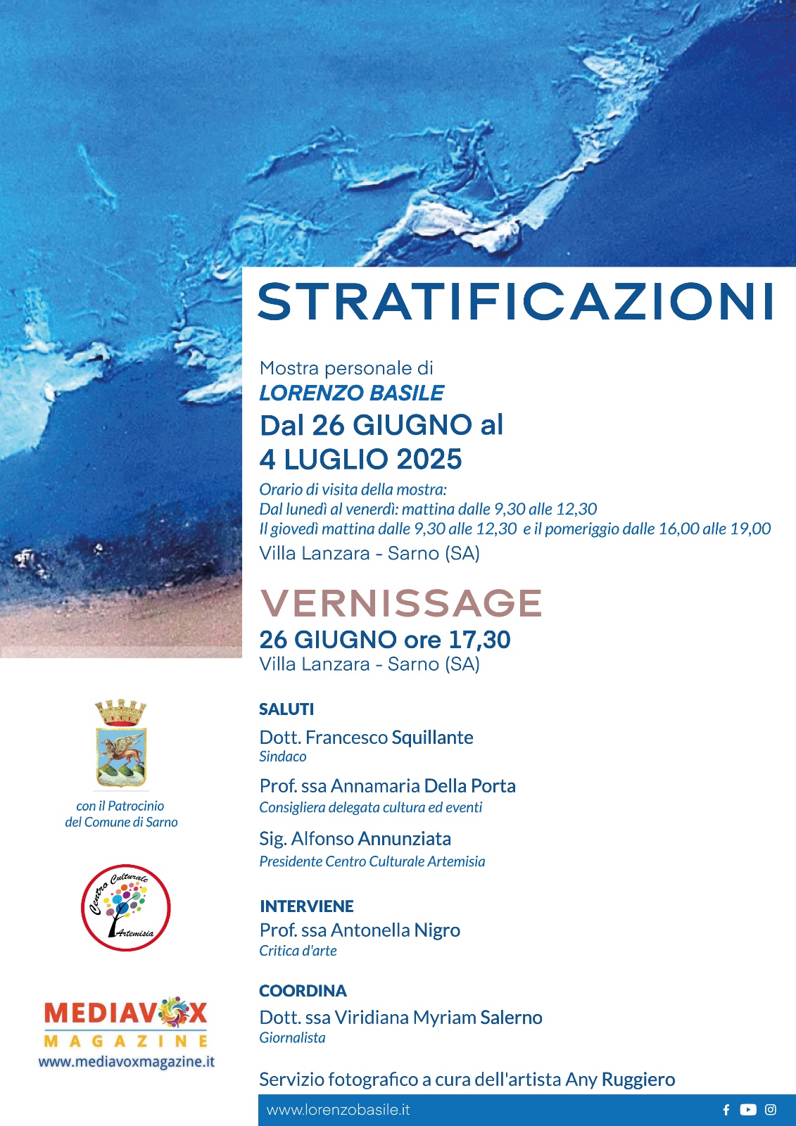 Sarà inaugurata il prossimo 26 giugno alle ore 17.30 presso la sala espositiva al terzo piano di Villa Lanzara, la mostra personale di pittura dell’artista Lorenzo Basile, intitolata “Stratificazioni”.