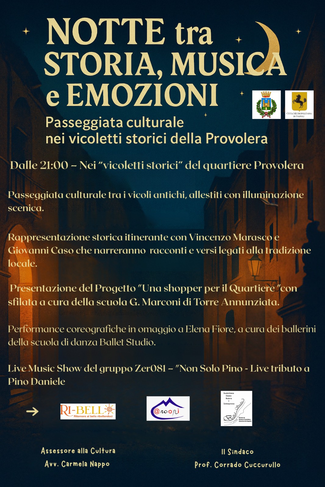 Al termine del concerto in chiesa, ad illuminarsi sarà il rione Provolera. Una passeggiata culturale tra i vicoli antichi, allestiti con illuminazione scenica. I visitatori, accompagnati dalla voce narrante di Giovanni Caso e guidati dallo storico Vincenzo Marasco, si immergeranno nella tradizione locale attraversi racconti e versi. Spazio anche alla moda con la presentazione del progetto “Una shopper per il quartiere” con sfilata a cura dell’I.I.S. G. Marconi.