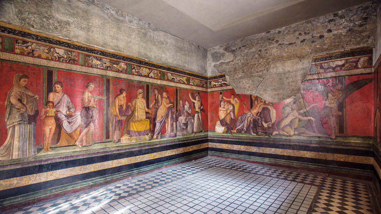 La villa dei Misteri, situata fuori le mura della città antica in direzione di Ercolano, è celebre per il grande fregio misterico, considerato unico, anche se recentemente è emersa una rappresentazione simile nella casa del Tiaso. Fu scavata parzialmente da privati nel 1909-1910, lasciando però gli affreschi privi di protezione adeguata. L’intervento sistematico arrivò solo vent’anni dopo, nel 1929-1930, sotto la guida del soprintendente Amedeo Maiuri, con uno scavo finanziato dal Banco di Napoli: un vero e proprio “ArtBonus” ante litteram.