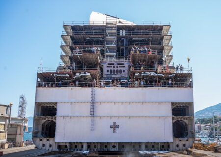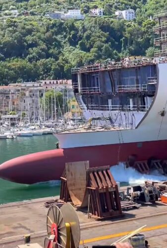 Nel cuore del cantiere navale di Castellammare di Stabia, sulle note solenni dell’Inno alla Gioia di Beethoven, si è compiuto il rito del varo tecnico del troncone di prua della futura “Viking Libra”. Con i tradizionali lanci dei guanti da parte degli operai in festa e sotto gli occhi di una città intera, la sezione anteriore della nave – lunga circa 113 metri e del peso di 5.200 tonnellate – ha toccato le acque del Golfo, tracciando un nuovo capitolo nella lunga storia della cantieristica stabiese.