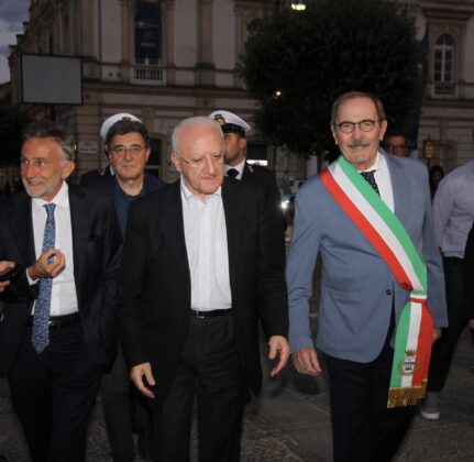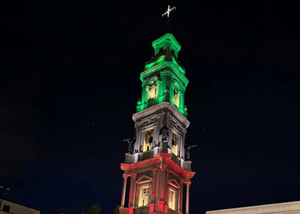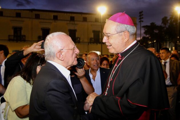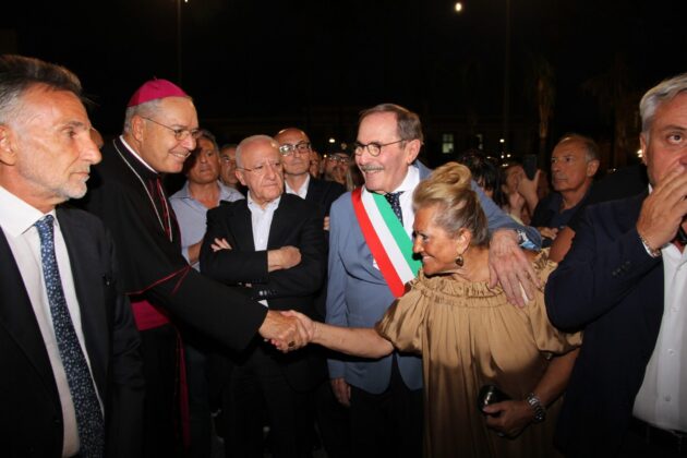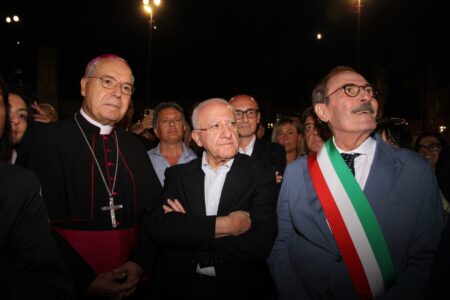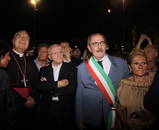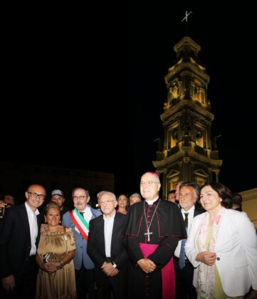 Il Santuario della Beata Vergine del Rosario di Pompei si accende di nuova luce grazie all’inaugurazione, avvenuta questa sera, di un’illuminazione artistica installata sul suo celebre campanile centenario. L’evento ha visto la partecipazione dell’arcivescovo Tommaso Caputo, del presidente della Regione Campania Vincenzo De Luca, del sindaco Carmine Lo Sapio e del presidente dell’EAV Umberto de Gregorio, suggellando una sinergia istituzionale al servizio della comunità e della spiritualità
