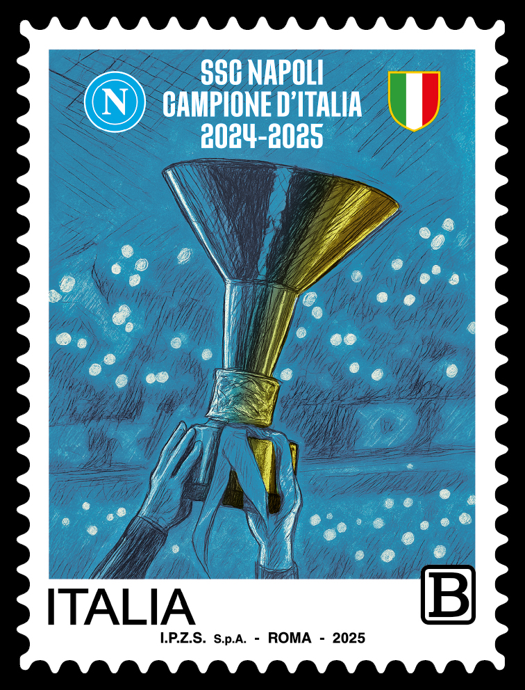 Il francobollo, del valore tariffario B (1,30€), raffigura due mani che sollevano al cielo la Coppa dello Scudetto, sullo sfondo degli spalti gremiti di tifosi. In alto compaiono il logo del Napoli e il tricolore. Completano la vignetta le scritte “SSC NAPOLI CAMPIONE D’ITALIA”, “2024-2025”, “ITALIA” e la tariffa.
