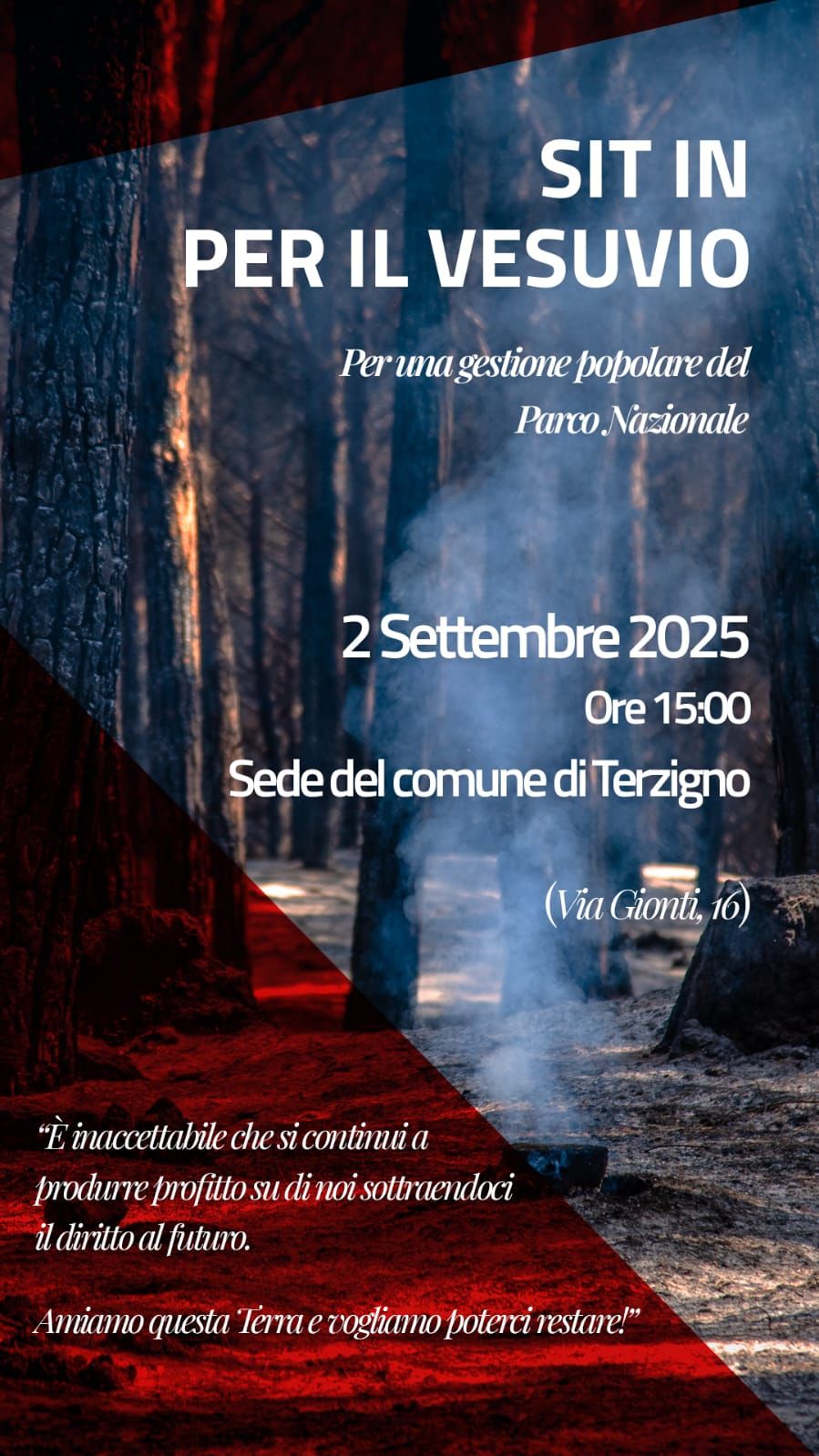 Il manifesto diffuso in questi giorni annuncia un nuovo appuntamento di mobilitazione: il 2 settembre 2025 alle ore 15:00 si terrà un sit in davanti al Comune di Terzigno, in via Gionti 16, con lo slogan “Per una gestione popolare del Parco Nazionale”.