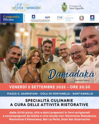 Ai Colli di Fontanelle, protagoniste le specialità culinarie e la musica della tradizione popolare, in tre appuntamenti, nell’ambito del cartellone degli eventi “rEstate Sintonizzati 2025” del Comune di Sant’Agnello. Si inizia domenica 31 agosto e venerdì 5 settembre con la manifestazione “t’AMMORrE per il Cuonti” realizzata nell’ambito del progetto “Alla riscoperta delle tradizioni” (FSC 2021/2027 DGR n.229 del 29/04/2025) inserito nel Programma di percorsi turistici di tipo culturale, naturalistico ed enogastronomico per la promozione turistica della Campania. Si conclude poi sabato 6 settembre con la “Serata di fine estate ai Colli di Fontanelle”.
