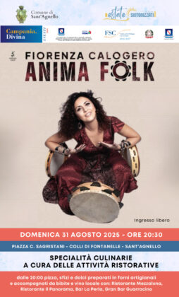 Filo conduttore degli appuntamenti, oltre ai percorsi enogastronomici, sarà la musica popolare. Domenica 31 agosto alle 20:30 in piazza si terrà il concerto “Anima Folk” con Fiorenza Calogero, un viaggio attraverso canti tradizionali della Campania e del Sud Italia dove vengono celebrati i valori e le storie di un tempo con un approccio moderno. Gli spettatori ascolteranno tammurriate, tarantelle, brani d’autore, canzoni classiche napoletane, in uno spettacolo che mescola sentimento ed erudizione. Nata e cresciuta a Castellammare di Stabia, Fiorenza Calogero è una delle voci di Napoli. La sua ventennale attività con il M° Roberto De Simone la porta ad intraprendere un cammino nel canto melodico di tradizione orale, la sua arte affonda le radici nei linguaggi e nelle suggestioni tipici della terra d’origine. La sua carriera è un percorso tra attività teatrali, cinematografiche e soprattutto concertistiche. La versatilità della voce, l’approccio sanguigno alla scrittura e l’espressività scenica, fanno di Fiorenza Calogero una delle più profonde interpreti della canzone tradizionale italiana.