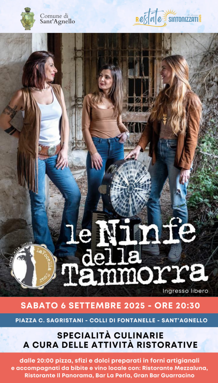 Infine sabato 6 settembre alle ore 20:30 per la “Serata di fine estate ai Colli di Fontanelle” si esibiranno “Le Ninfe della Tammorra”, dirette da Serena Della Monica, gruppo musicale che fonde la musica tradizionale campana con sonorità moderne. Il gruppo, attivo da oltre quindici anni, si è esibito in Italia e all’estero, ottenendo vari riconoscimenti, tra cui il premio della critica “Mia Martini” nel 2018 e 2023. Hanno pubblicato tre album: “Ile Oyo” (2007), “Scaramantrika” (2014) e “Femmene” (2022). La formazione è composta da Serena Della Monica (voce e fisarmonica), Sara Schiavo (voce), Carlotta D’Avino (danza), Giuseppe Di Donna (chitarra), Gianmarco Volpe (mandola), Mario Scassillo (batteria) e Amleto Livia (violino).