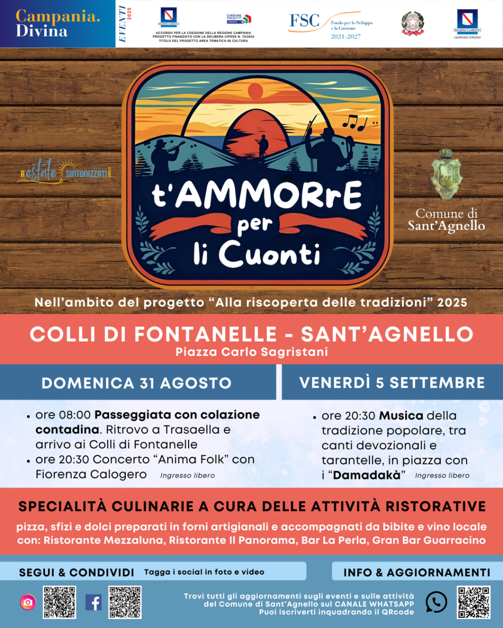 Ai Colli di Fontanelle, protagoniste le specialità culinarie e la musica della tradizione popolare, in tre appuntamenti, nell’ambito del cartellone degli eventi “rEstate Sintonizzati 2025” del Comune di Sant’Agnello. Si inizia domenica 31 agosto e venerdì 5 settembre con la manifestazione “t’AMMORrE per il Cuonti” realizzata nell’ambito del progetto “Alla riscoperta delle tradizioni” (FSC 2021/2027 DGR n.229 del 29/04/2025) inserito nel Programma di percorsi turistici di tipo culturale, naturalistico ed enogastronomico per la promozione turistica della Campania. Si conclude poi sabato 6 settembre con la “Serata di fine estate ai Colli di Fontanelle”.