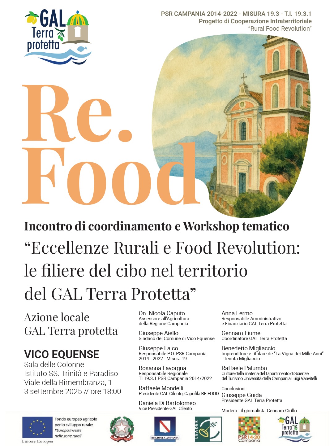 Il progetto Rural Food Revolution – Re-Food, promosso dal GAL Terra Protetta insieme ad altri 10 GAL campani, ha puntato alla valorizzazione dei sistemi alimentari tipici delle aree rurali, promuovendo il legame tra prodotto e territorio come leva di sviluppo sostenibile per le filiere agroalimentari ed enoturistiche. Gli obiettivi principali sono stati lo sviluppo delle filiere locali, la tutela della biodiversità, il miglioramento della qualità della vita nelle aree rurali e l’integrazione tra paesaggio, cultura e agricoltura.