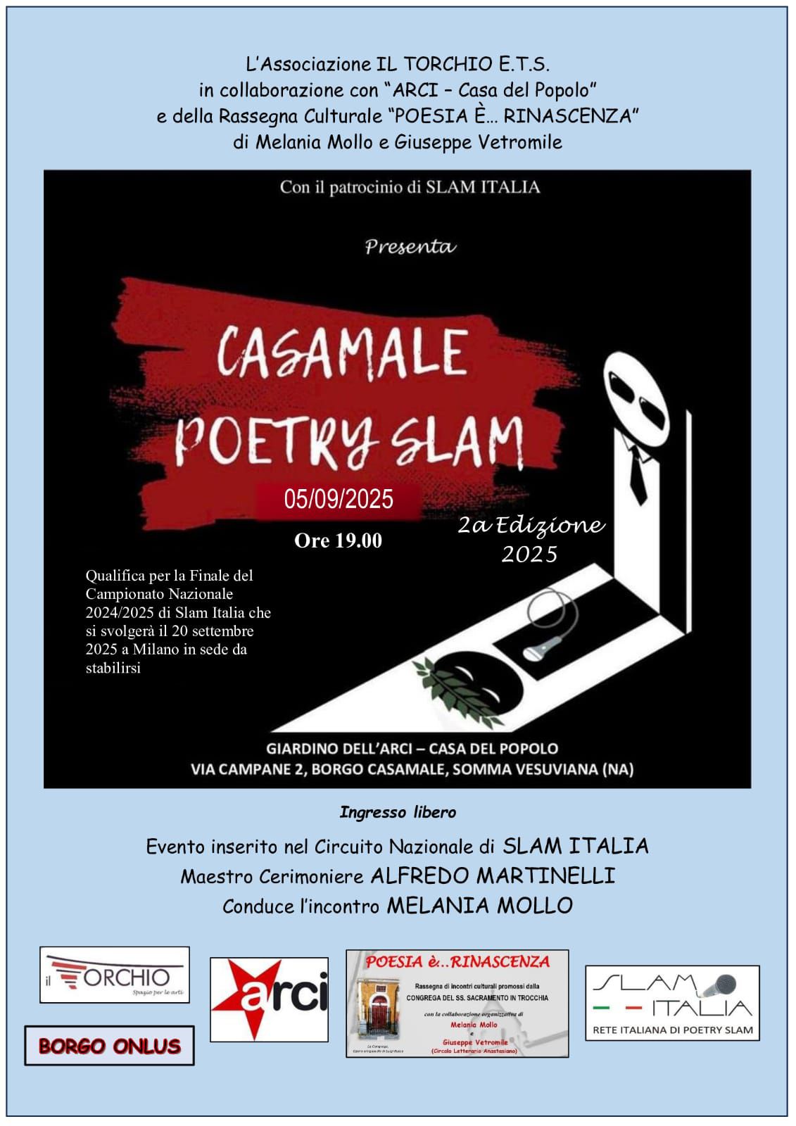 L’evento, con il patrocinio di Slam Italia, è organizzato in stretta collaborazione tra l’associazione “Il Torchio E.T.S.”, l’ARCI – Casa del Popolo di Somma Vesuviana, e la rassegna “Poesia è… Rinascenza” di Melania Mollo e Giuseppe Vetromile.