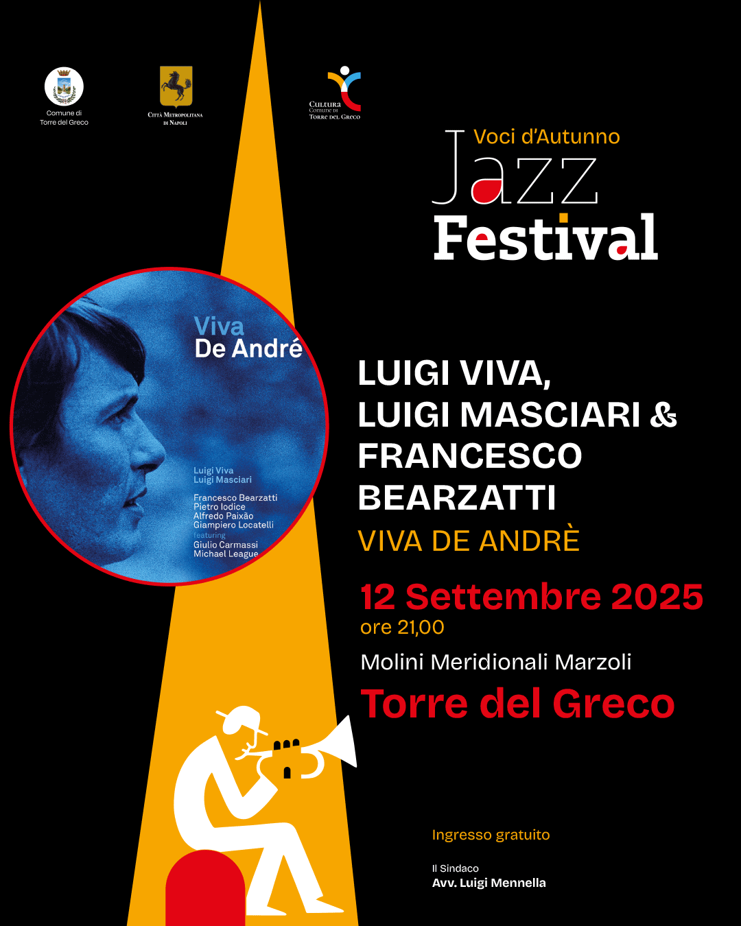 La terza serata, quella di venerdì, sarà un vero e proprio concerto-racconto dedicato a Fabrizio De Andrè, ideato e narrato da Luigi Viva, che guiderà il pubblico attraverso le tappe più significative della vita e della carriera del cantautore genovese. Musica e parole si fonderanno grazie a un ensemble d’eccezione: Francesco Bearzatti (sax, clarinetto), Luigi Masciari (chitarra, direzione musicale e arrangiamenti), Giampiero Locatelli (piano), Francesco Poeti (basso) e Pietro Iodice (batteria).
